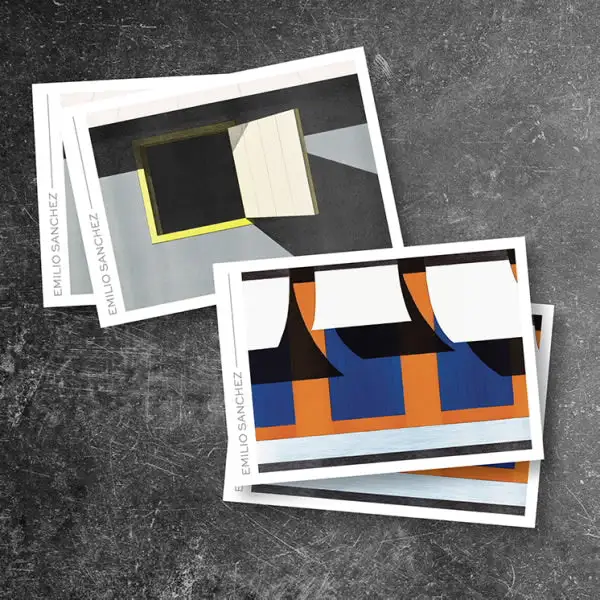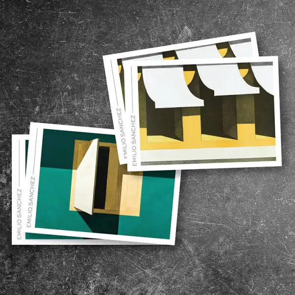Each of the four stamp designs pictures a different piece of art by Emilio Sanchez: “Los Toldos” (1973), “Ty’s Place” (1976), “En el Souk” (1972), and Untitled (Ventanita entreabierta) (1981).