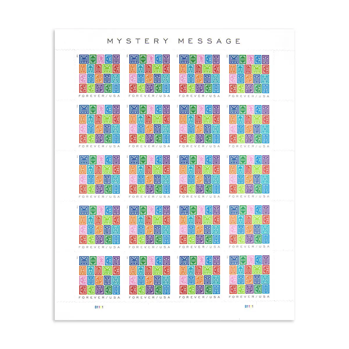 The new Mystery Message Forever stamp is designed to put your sleuthing skills to the test! Featuring bright colors and interesting shapes, the stamp design is a visual riddle spelling out a difficult-to-discern message. Each colorful square contains a letter in an interesting pattern.
