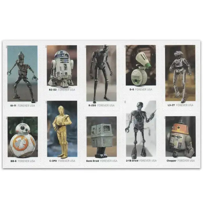 In the?Star Wars?universe, there are countless droids who help keep things running. ?Whether on the side of the heroes or the villains, droids have always played an important role. ?Over the years, we have seen astromechs in charge of piloting X-wing fighters, protocol droids who translate different languages, droids programmed for battle, and many more. ?The 2021 set of 10 US stamps picture a small handful of them. ?Some are quite famous, while others are more obscure: ?IG-11, R2-D2, K-2SO, D-O, L3-37, BB-8, C-3PO, GNK (or GONK), 2-1B, and C-1-10P ("Chopper").