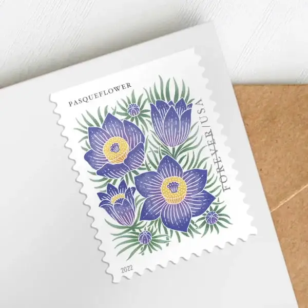 Stamp Design: Featuring a purple pasqueflower, the design captures the essence through a meticulous hand-drawn illustration, transformed into a block print-style aesthetic by the talented Lili Arnold.
