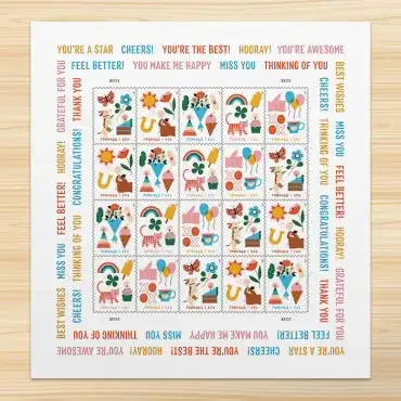 The pane of 20 stamps features five unique designs filled with a variety of whimsical images, including flowers, balloons, cute animals, sweet treats and symbols of good luck. Capturing the excitement and delight of receiving a card in the mail meant just for you, each digital illustration uses a cohesive color palette to bring together the disparate icons in the designs. Words of encouragement and thoughtful affirmations surround the stamps on the pane in the same tones. Each greeting is die-cut and self-adhesive.