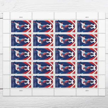 The stamp artwork depicts a female soccer player in action, striking a ball with a side volley. Conjuring the aesthetic of mid-century print design, illustrator Noah MacMillan (1988-2022) used simplified shapes and bold colors to convey the high energy and fast motion of the sport. The somewhat grainy rendering lends a timeless quality to the design, evoking not just a single all-star athlete or era, but the entire legacy of women?¡¥s soccer.